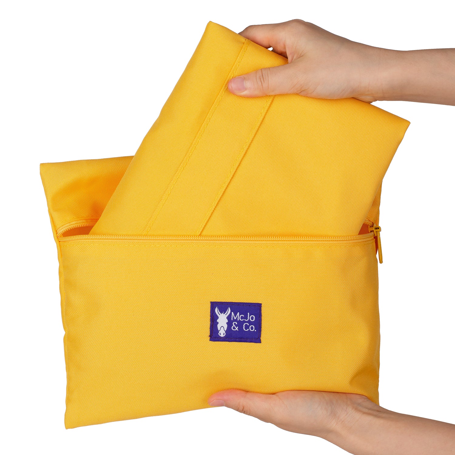 When you’re done, fold the tote small and tuck it inside its travel pouch — compact, convenient, and ready for your next adventure.